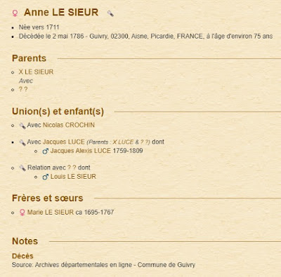 Décès d’Anne Le Sieur, âgée de soixante quinze ans environ, munie des sacrements de l’église donnés par le curé Baudouin. Anne Le Sieur est veuve en première noce de Jacques Luce, manouvrier, et en secondes noces de Nicolas Crochin, tailleur d’habits. L’acte de décès rédigé par le curé Baudouin est signé par Jacques Luce, fils de la défunte, manouvrier habitant Ugny-le-Gay, et Charles François Luce, petit fils de la défunte.